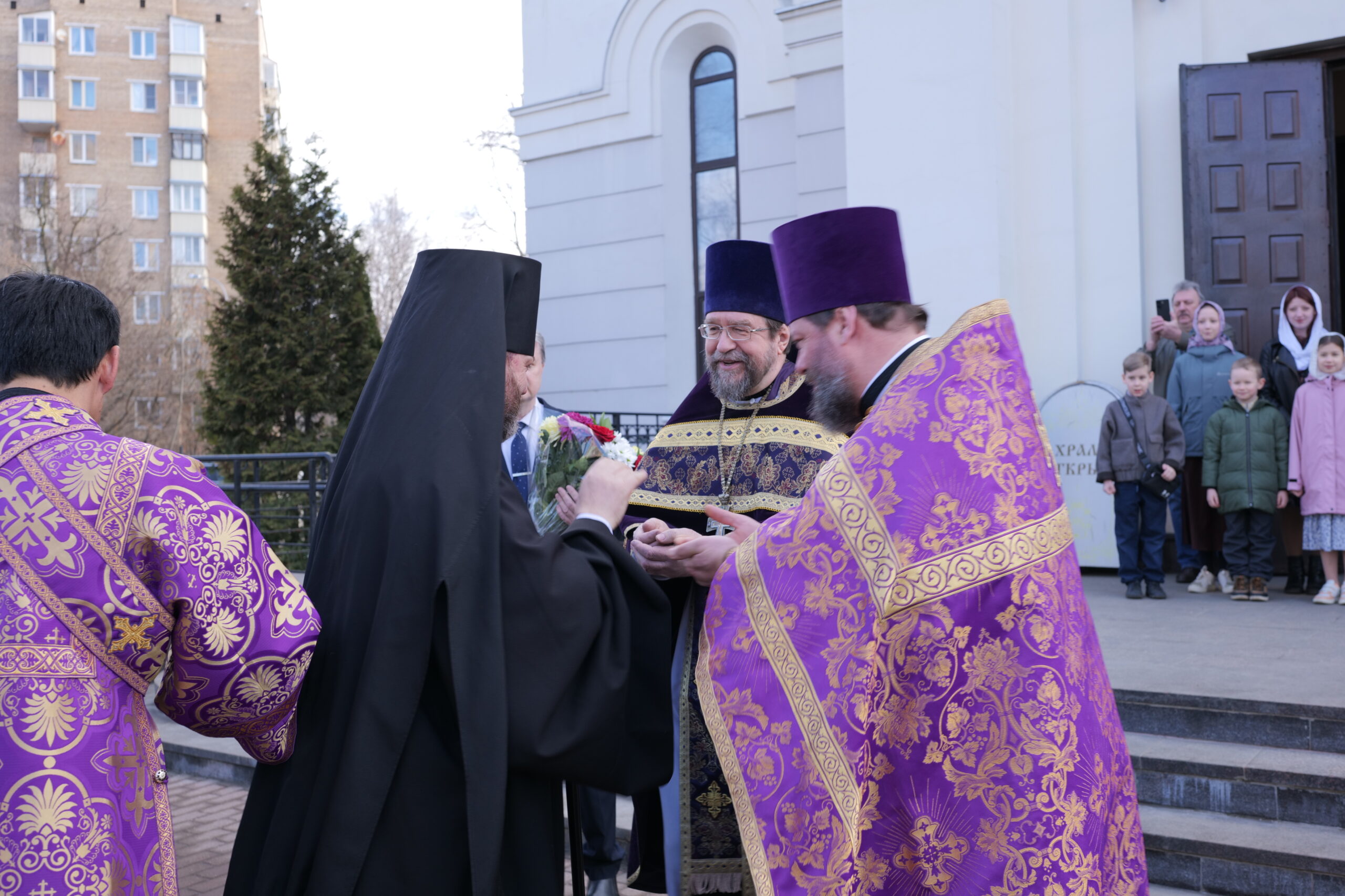 Его Высокопреосвященству сослужили: иерей Сергий Куксов, благочинный храмов Георгиевского округа Западного викариатства г. Москвы, протоиерей Андрей Смирнов, настоятель нашего храма, протоиерей Леонид Олейник, настоятель храма Смоленской иконы Божией Матери в Фили-Давыдкове, протоиерей Андрей Галухин, настоятель храма преподобного Андрея Рублева в Раменках, иерей Роман Граничников, и.о. настоятеля храма преподобной Ефросинии Полоцкой в Кунцеве; духовенство храма. Диаконский чин возглавил диакон Тимофей Рзянин.